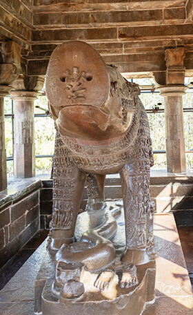 I left the museum and returned to the western complex, and this time I was cautious and more alert. As I entered the gate I told myself, “There is no need to hop from temple to temple. Start here, where you are.” I took the first left-turning path and saw a small temple with two enormous temples looming behind it. The little temple intrigued me. It had no walls—the roof was supported only by pillars—and as I approached I saw that the interior was almost entirely filled by the monolith of a huge animal. A nearby sign read: Varaha Mandir [the temple of the boar incarnation of Vishnu].